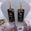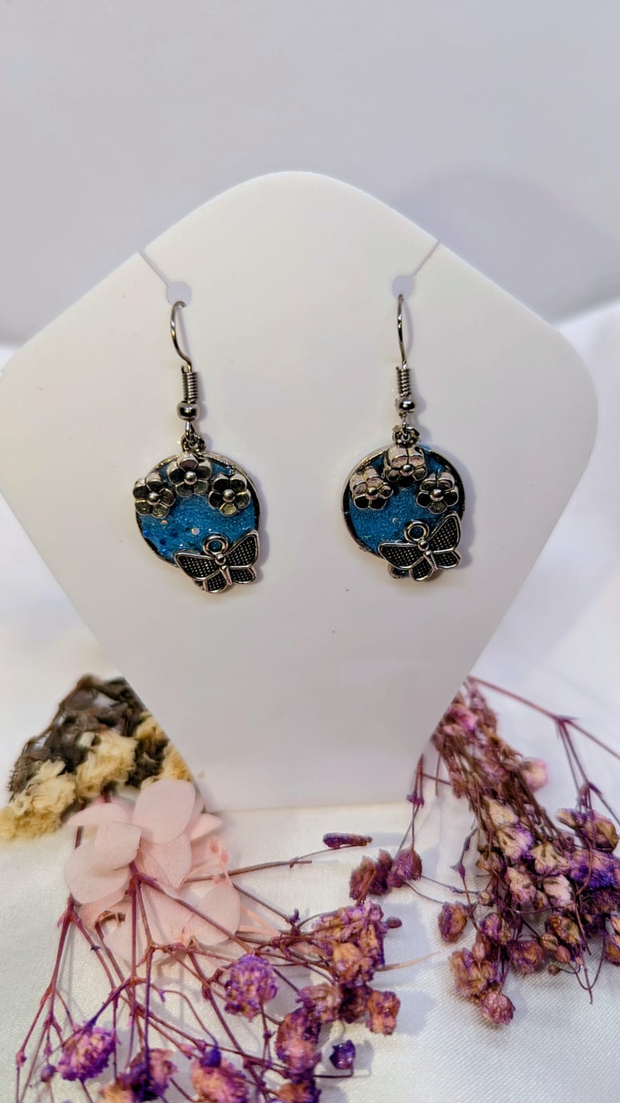 Handcrafted resin drop earrings with butterfly and floral details, finished in gold tones for an elegant, feminine look.