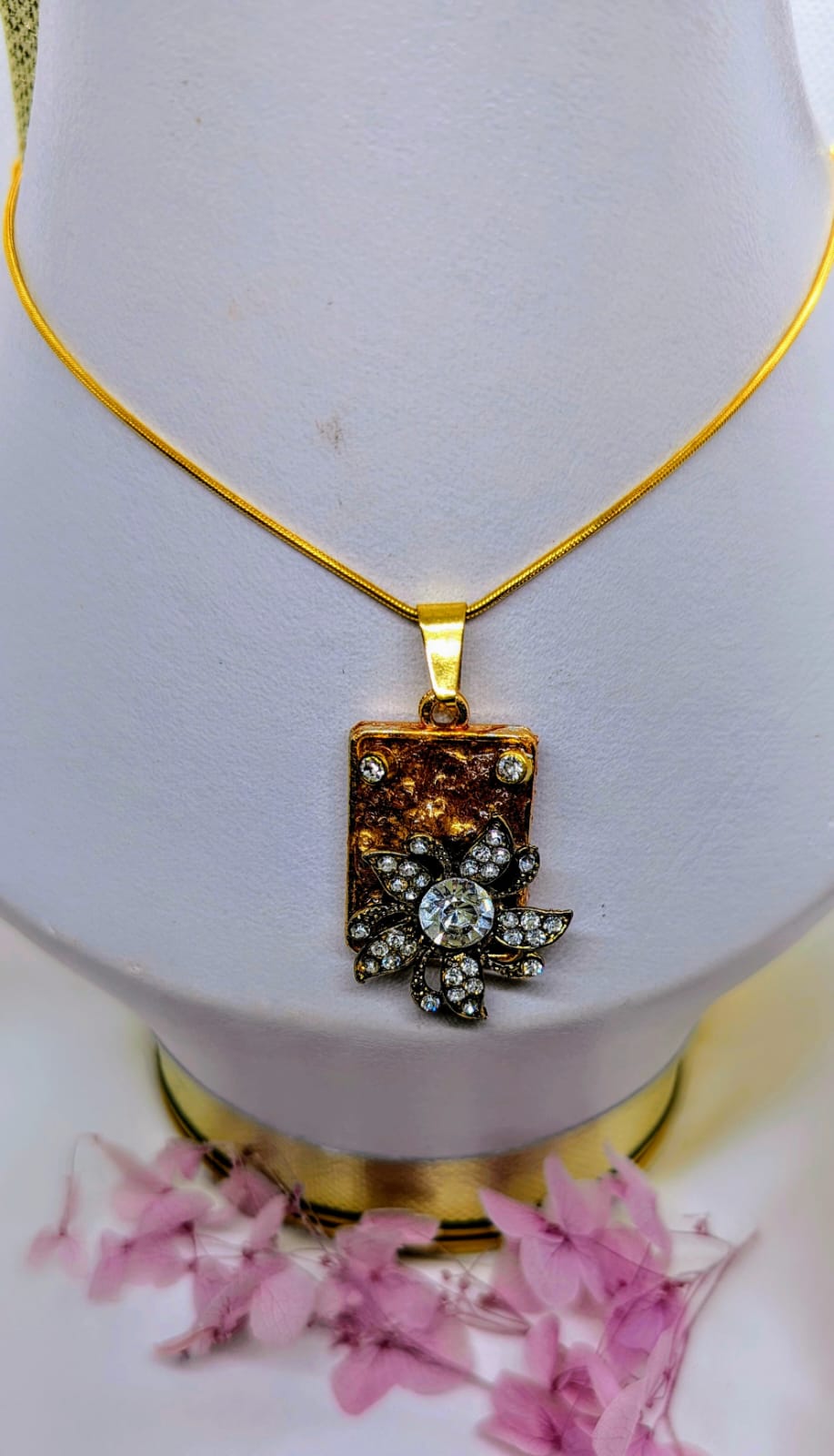 Handmade crystal flower pendant necklace in antique gold tone. A unique, elegant piece for women and girls who love timeless handmade jewelry..