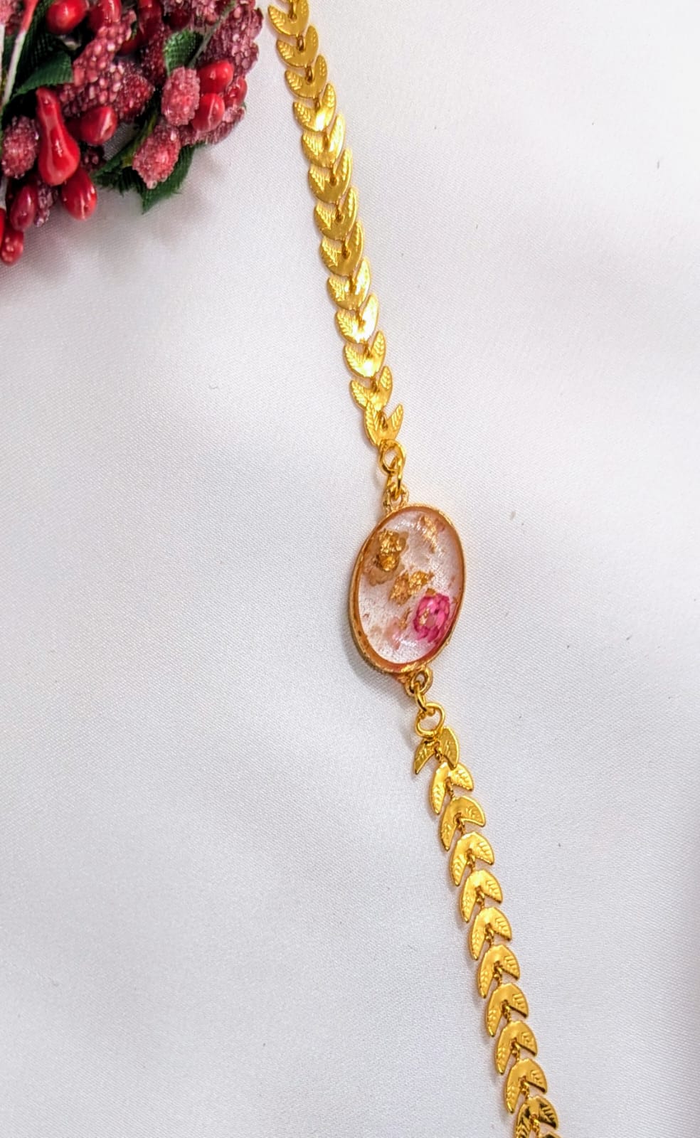Handmade Pink Flower Resin Chain Bracelet Gold Tone